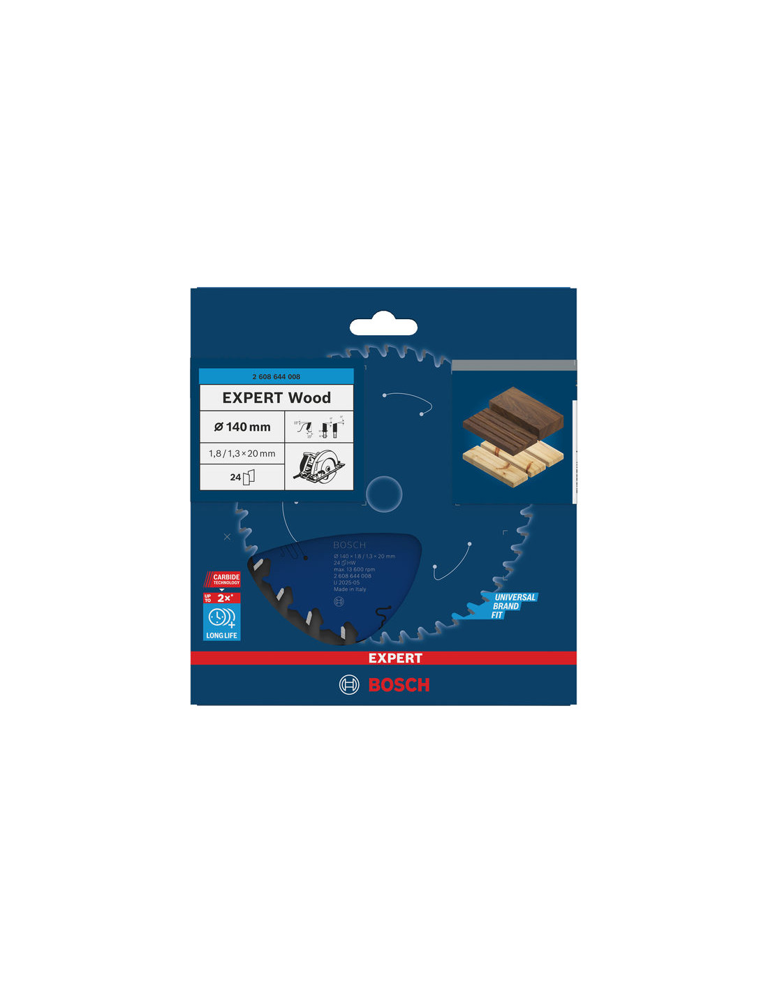 Do 2-krat daljša življenjska doba kot pri listu za krožno žago Eco for Wood - Pri rezanju lesenih tramov je najbolje uporabiti ročno krožno žago, ki je dovolj ostra in trpežna za rezanje vseh vrst lesa in kompozitnega lesa. Zasnovali smo trpežni list za krožno žago EXPERT Wood za preprosto omogočanje dela – vedno znova. EXPERT Wood je list za krožno žago, ki ga lahko uporabiš pri opravilih z ročno krožno žago. V pomoč bo pri učinkovitem rezanju vseh vrst lesa in kompozitnega lesa – vedno znova. List EXPERT Wood ima naostrene tanke karbidne zobe, izdelane z Boschevo tehnologijo Carbide Technology. To pomeni, da omogoča čiste, natančne reze in ima daljšo življenjsko dobo od vseh drugih listov za krožno žago za rezanje lesa, ki so na voljo v naši ponudbi. Vključili smo dodatno prevleko za preprečevanje kopičenja toplote in zaščito pred korozijo. Luknja deluje z reducirnimi obroči ali brez njih, da ustreza različnim velikostim