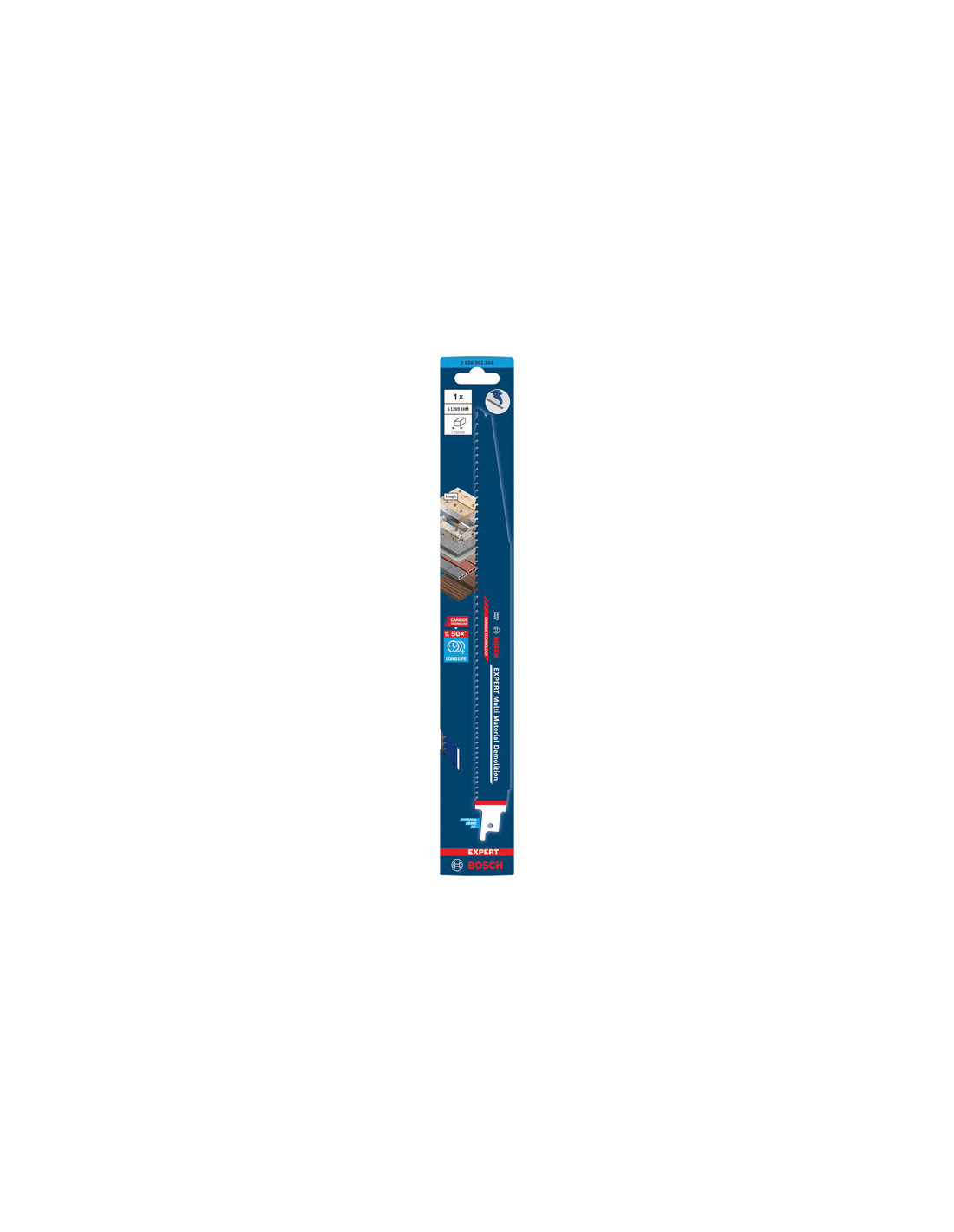 Do 50-krat daljša življenjska doba kot pri listu Bosch S1111DF pri rezanju zahtevnih materialov - Ko morate porušiti najrobustnejše konstrukcije in okovje, je list za sabljasto žago Bosch EXPERT Multi Material vaša prava izbira: prenesel bo vsako zlorabo in nadaljeval z rezanjem. Za najtežja rušilna dela je Bosch razvil list EXPERT Multi Material Demolition. Progresivni nagib zagotavlja, da ga ne presenetijo spremembe debeline materiala. Posamezno ojačani robovi zob prenesejo najhujše udarce utrjenih pritrdilnih elementov, vgrajenih v les. Močan zob v obliki krempljev vam pomaga hitro ugrizniti v material. In vse to je podprto s sposobnostjo karbida, da pretrga vse, kar mu je na poti. Kaj je še močnejše od Boschevega karbidnega lista? Seveda Boschev karbidni list z ojačanimi zobmi! Včasih je obraba lista pri rušilnih delih tako velika, da se zobje odtrgajo. Zato smo jih naredili še močnejše. Primerno za vsa S-vpenjalna stebla za sabljaste žage
