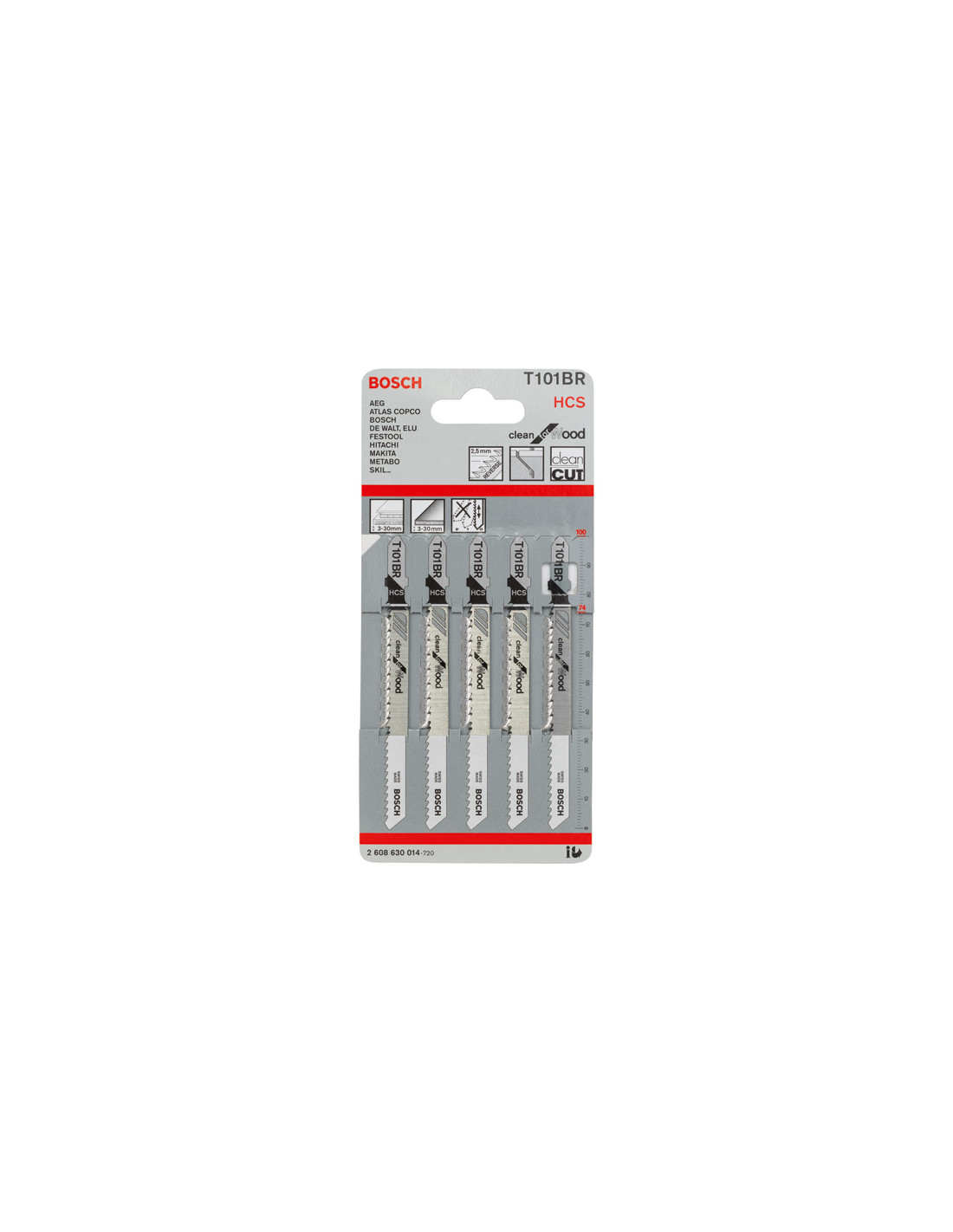 Čisti rezi v mehak les - List za vbodno žago T 101 BR Clean for Wood izdeluje čiste ravne reze v les. Natančno brušeni zobje s koničastim telesom zagotavljajo čiste rezultate. List iz ogljikovega jekla HCS je primeren za mehak les in neabrazivne lesne materiale. Nasprotno usmerjeni zobje omogočajo rezanje brez trganja površine. List ima majhen, progresiven razmak med zobmi (2,5 mm) za rezanje lesnih materialov debeline 3–30 mm. Primerno za vbodne žage z vpenjalnimi sistemi za T-steblo. Primerno za vsa T-vpenjalna stebla za vbodne žage