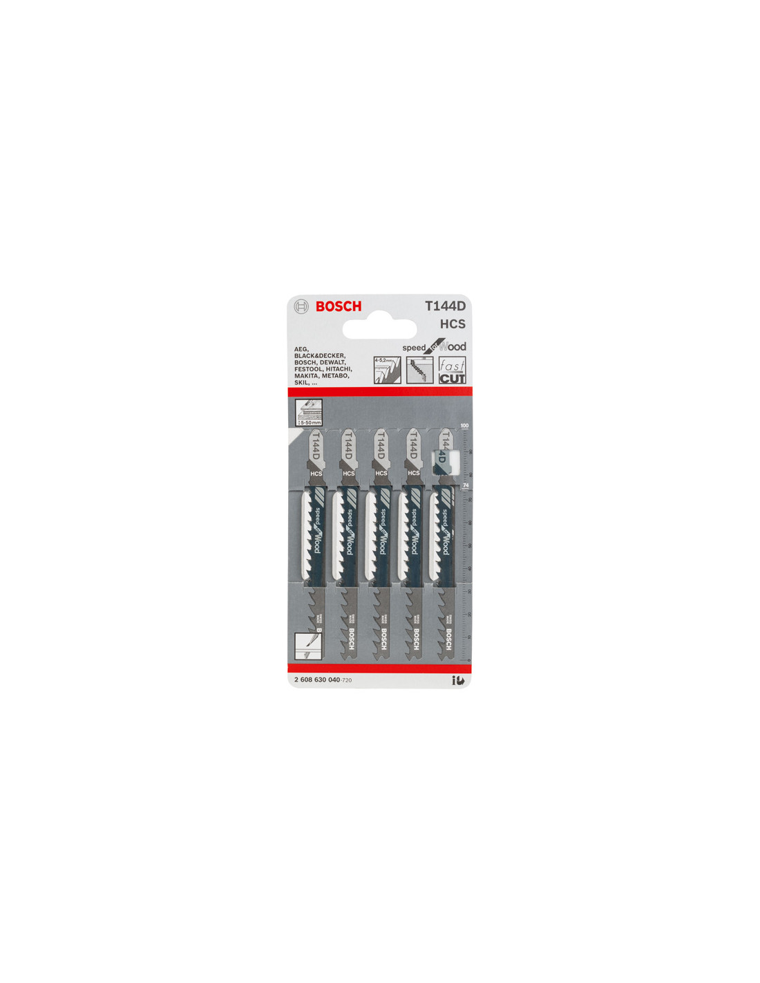 Hitri rezi v mehak les - List za vbodno žago T 144 D Speed for Wood izdeluje hitre ravne reze v les. Ostri bočni zobje omogočajo hitre rezultate. List iz ogljikovega jekla HCS je primeren za mehak les in neabrazivne lesne materiale. Širok progresivni razmak med zobmi (4–5,2 mm) omogoča rezanje različnih lesnih materialov debeline 5–50 mm. Primerno za vbodne žage z vpenjalnimi sistemi za T-steblo. Primerno za vsa T-vpenjalna stebla za vbodne žage
