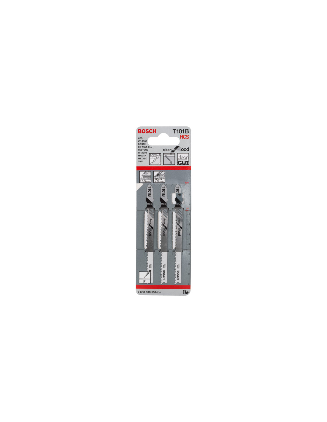Čisti rezi v mehak les - List za vbodno žago T 101 B Clean for Wood izdeluje čiste ravne reze v les. Natančno brušeni zobje s koničastim telesom zagotavljajo brezhibne rezultate. List iz ogljikovega jekla HCS je primeren za rezanje mehkega lesa in neabrazivnih lesnih materialov. List ima majhen progresivni razmak med zobmi (2,7 mm) za rezanje lesnih materialov debeline 3–30 mm. Primerno za vbodne žage z vpenjalnimi sistemi za T-steblo. Primerno za vsa T-vpenjalna stebla za vbodne žage