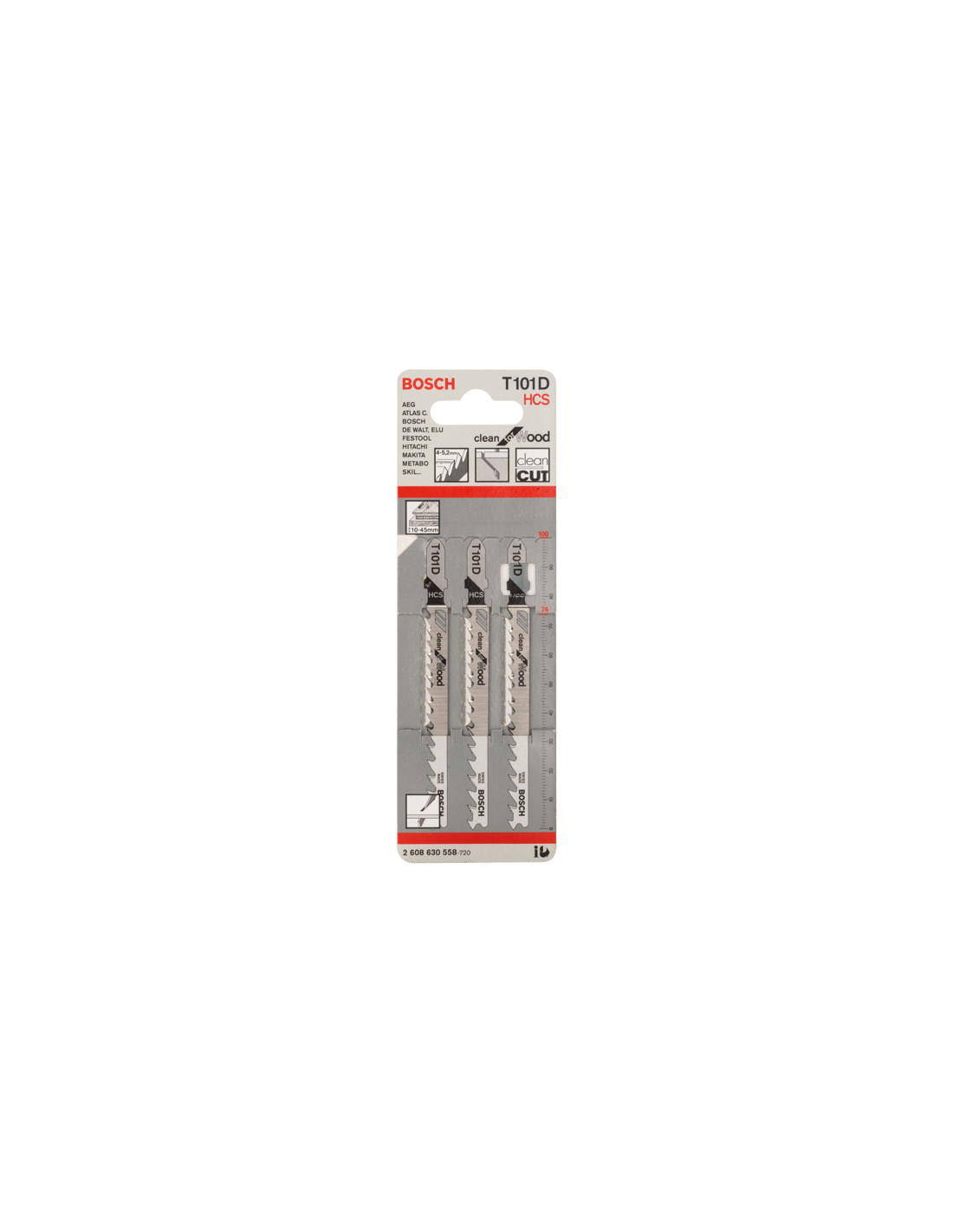 Čisti rezi v mehak les - List za vbodno žago T 101 D Clean for Wood izdeluje čiste ravne reze v les. Natančno brušeni zobje s koničastim telesom zagotavljajo čiste rezultate. List iz ogljikovega jekla HCS je primeren za rezanje mehkega lesa in neabrazivnih lesnih materialov. List ima širok progresivni razmak med zobmi (4–5,2 mm) za rezanje lesnih materialov debeline 10–45 mm. Primerno za vbodne žage z vpenjalnimi sistemi za T-steblo. Primerno za vsa T-vpenjalna stebla za vbodne žage