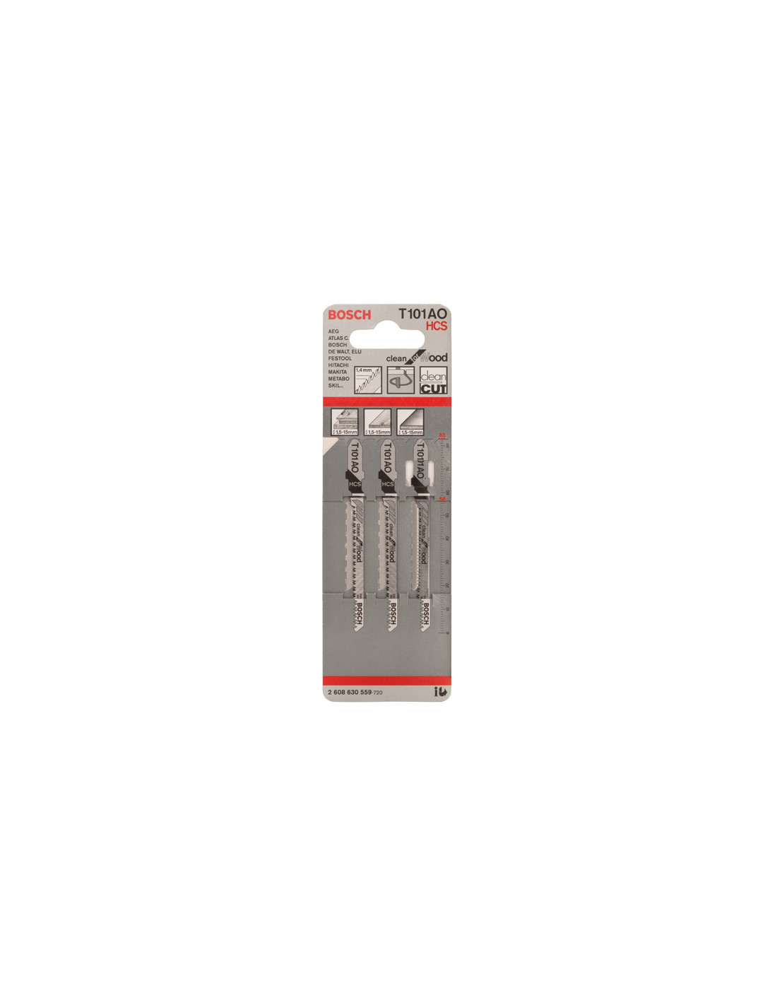 Čisti krivuljni rezi - List za vbodno žago T 101 AO Clean for Wood izdeluje čiste krivuljne reze v les. Natančno brušeni zobje s koničastim telesom in ozek list zagotavljajo krivuljne reze z brezhibnimi rezultati. Koničasta oblika zob zmanjšuje trganje. List iz ogljikovega jekla HCS je primeren za mehak les in neabrazivne lesne materiale. List ima zelo majhen razmak med zobmi (1,4 mm) za rezanje zelo tankih lesnih materialov debeline 1,5–15 mm. Primerno za vbodne žage z vpenjalnimi sistemi za T-steblo. Primerno za vsa T-vpenjalna stebla za vbodne žage