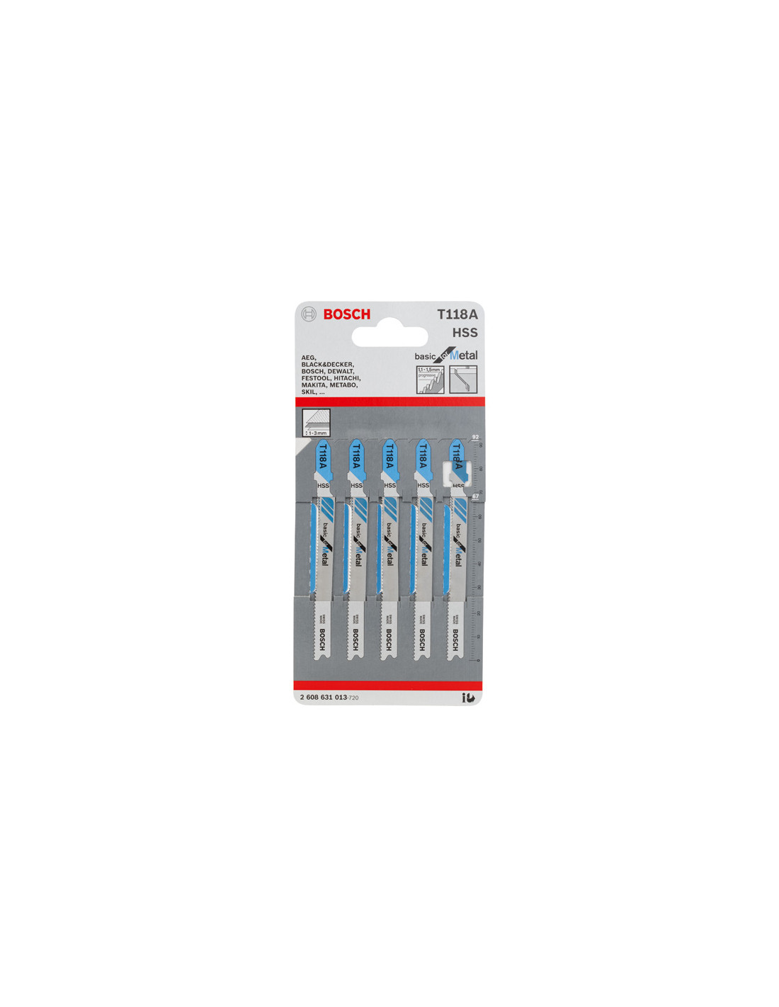 Rezi v pločevino - List za vbodno žago T 118 A Basic for Metal izdeluje ravne reze v kovino. Rezkani, valovito razporejeni zobje so idealni za rezanje brez posebnih zahtev. List iz popolnoma utrjenega, visokokakovostnega hitroreznega jekla HSS je primeren za rezanje neperforirane pločevine običajne trdote. Zelo majhen progresivni razmak med zobmi (1,1–1,5 mm) omogoča rezanje zelo tanke masivne pločevine debeline 1–3 mm. Primerno za vbodne žage z vpenjalnimi sistemi za T-steblo. Primerno za vsa T-vpenjalna stebla za vbodne žage