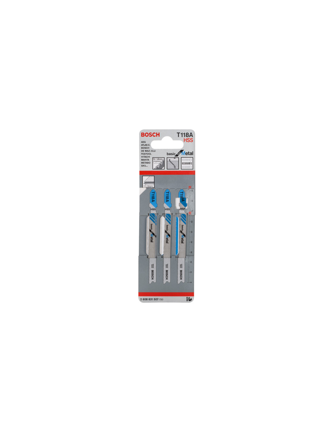Rezi v pločevino - List za vbodno žago T 118 A Basic for Metal izdeluje ravne reze v kovino. Rezkani, valovito razporejeni zobje so idealni za rezanje brez posebnih zahtev. List iz popolnoma utrjenega, visokokakovostnega hitroreznega jekla HSS je primeren za rezanje neperforirane pločevine običajne trdote. Zelo majhen progresivni razmak med zobmi (1,1–1,5 mm) omogoča rezanje zelo tanke masivne pločevine debeline 1–3 mm. Primerno za vbodne žage z vpenjalnimi sistemi za T-steblo. Primerno za vsa T-vpenjalna stebla za vbodne žage