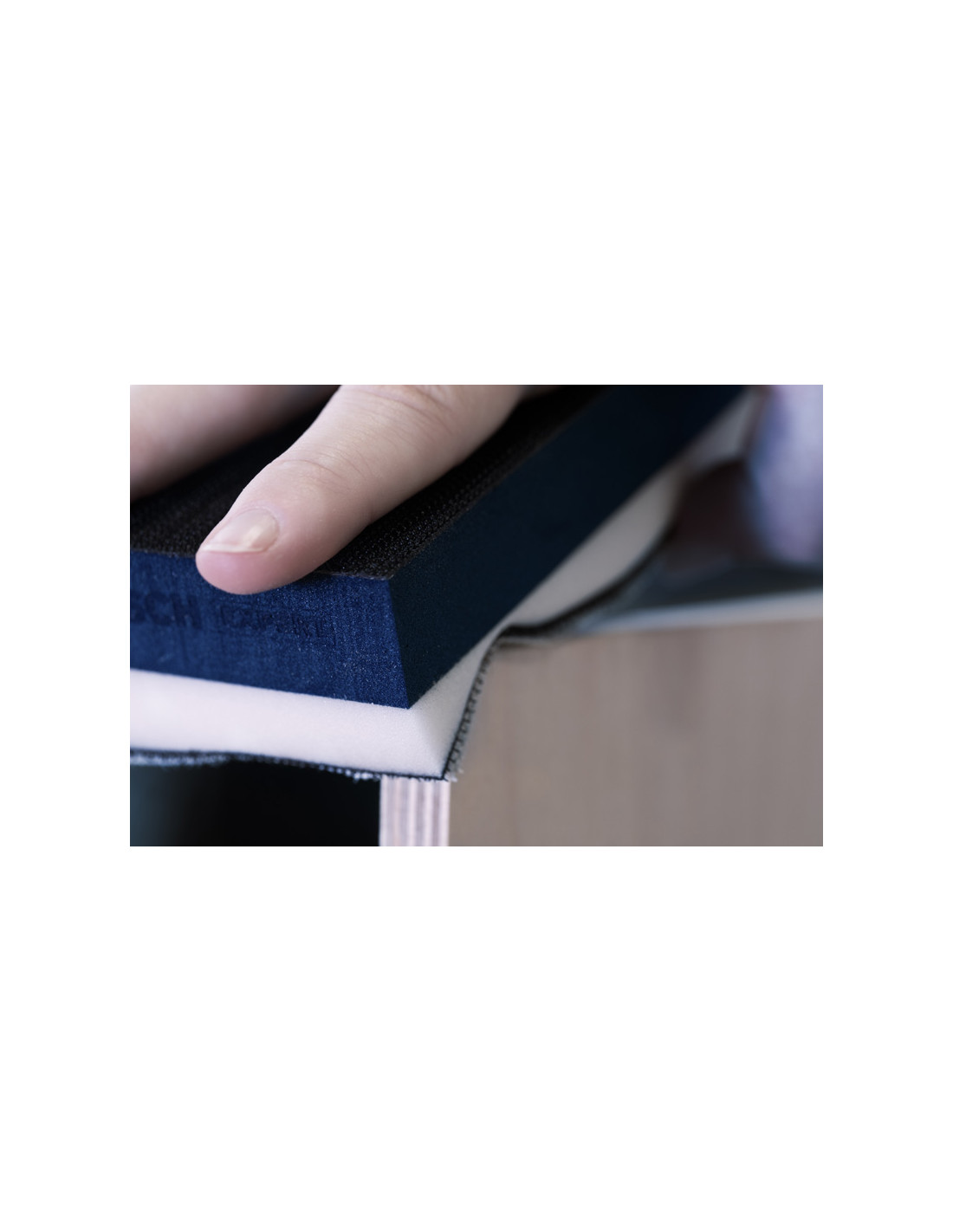 3-v-1, brušenje ravnih površin, krivin in profilov - Brusni blok EXPERT M480 Dual Density je vsestranski brusni blok za brušenje obdelovancev kompleksnih oblik. Blok ima stran z visoko gostoto za brušenje površin in stran z nizko gostoto za prilagajanje krivinam in robovom. Obe strani imata pritrdilno tkanino, da lahko brusni papir zlahka pritrdiš in odstraniš. Boscheva tehnologija Particle Control zagotavlja, da gre prah skozi brusno mrežo, ne da bi jo zamašil. Pritrditev s pomočjo sprijemalnega sistema