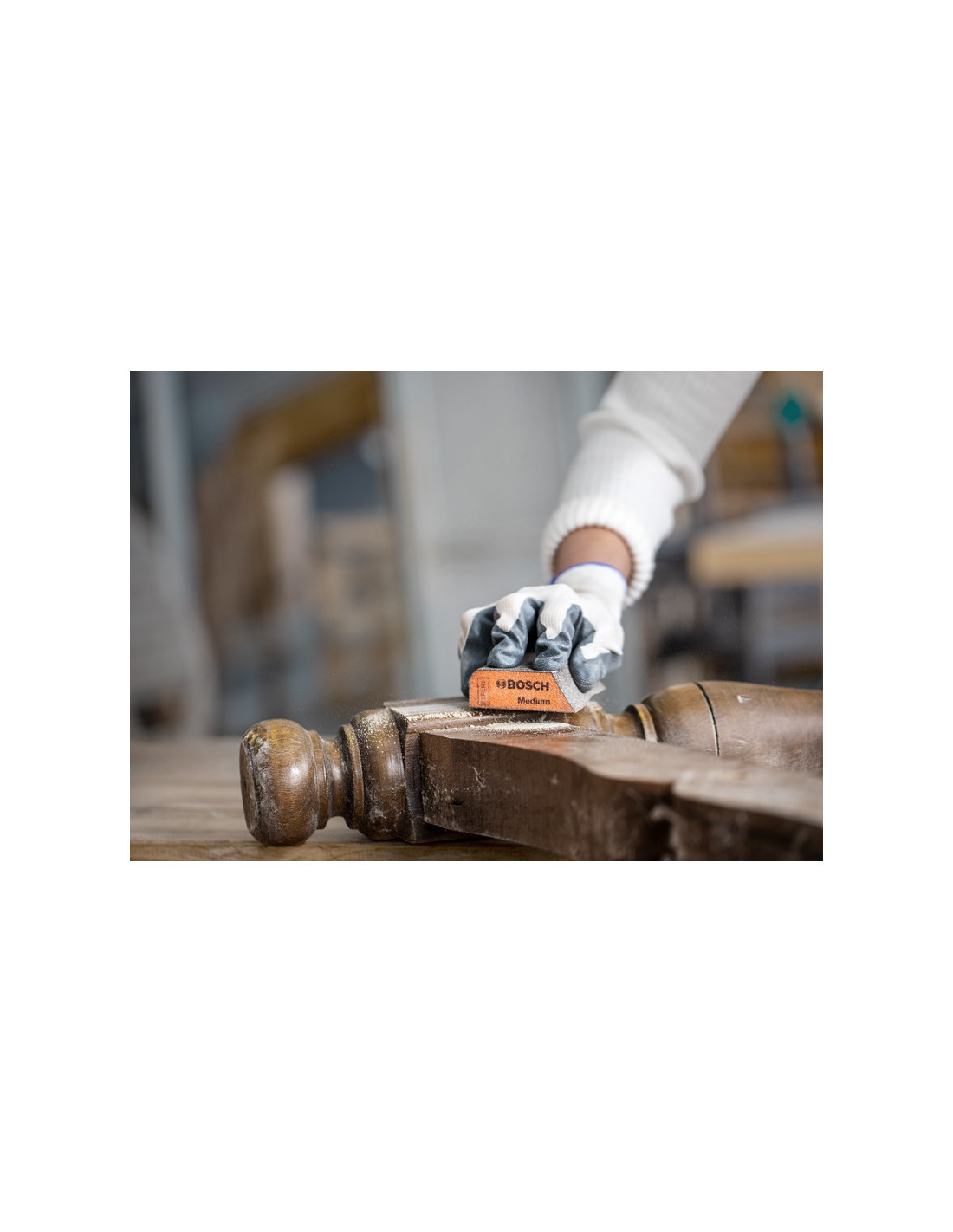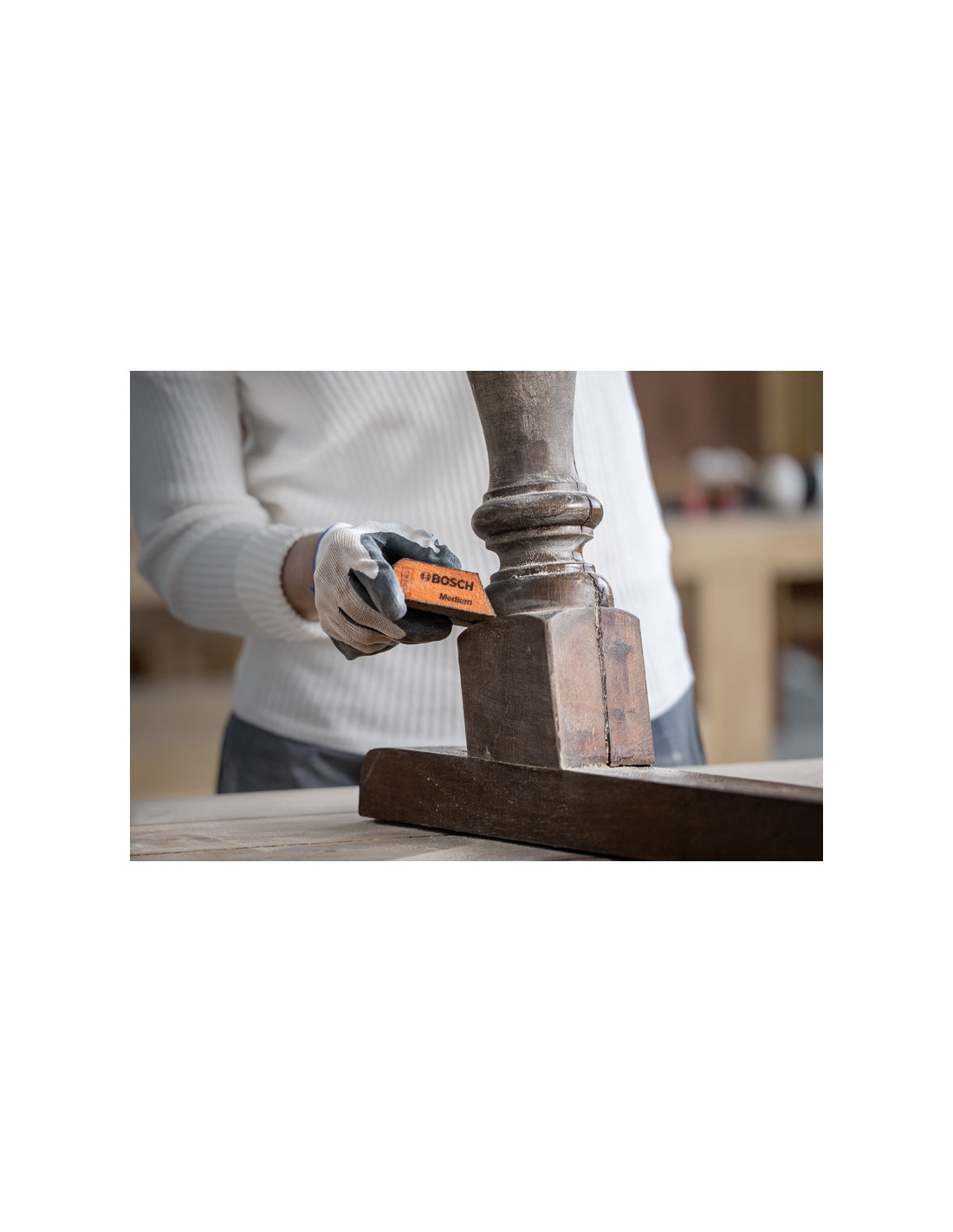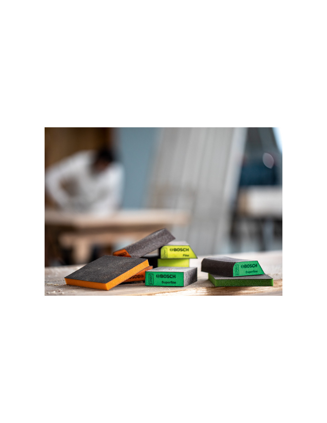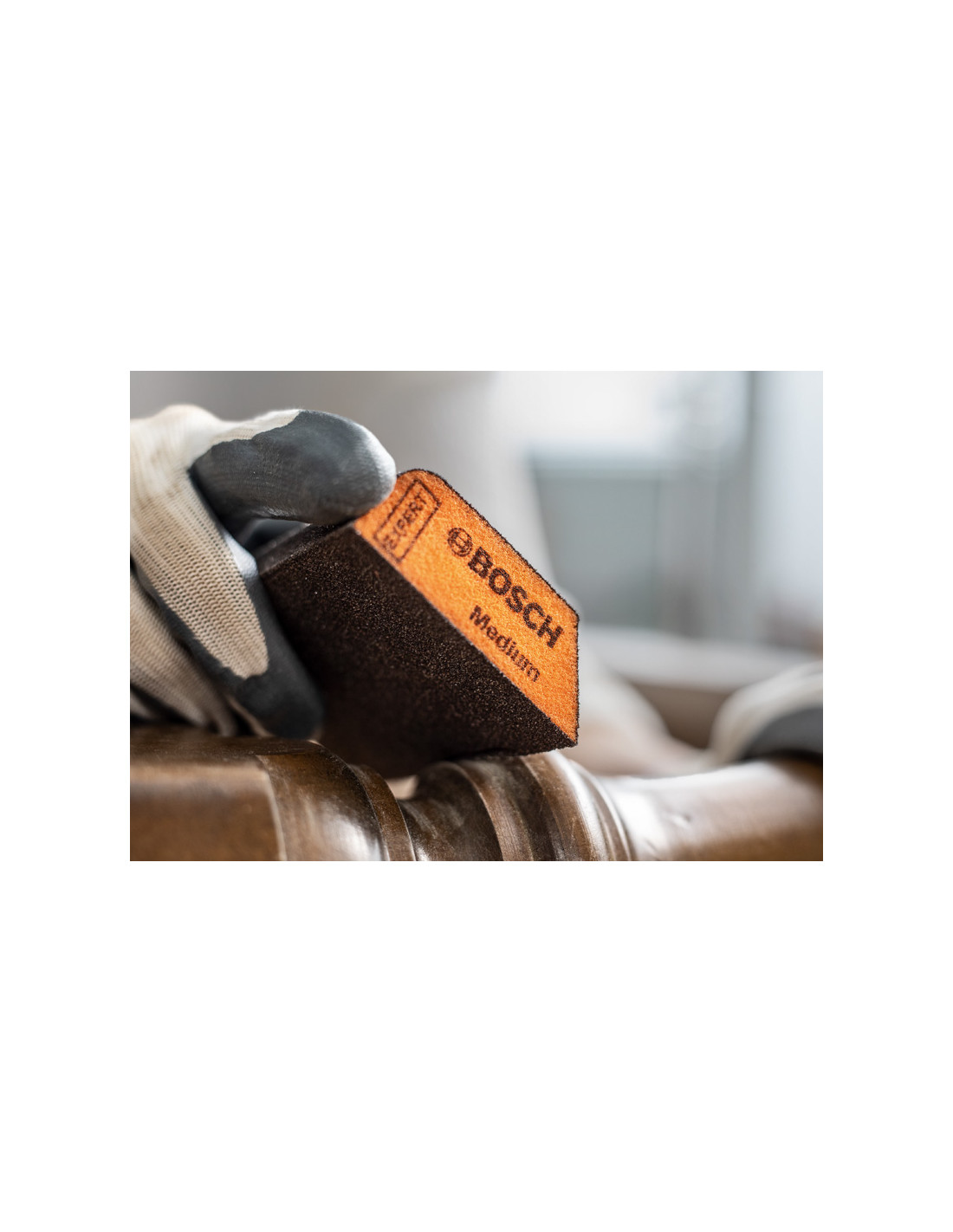 Do 5-krat daljša življenjska doba kot pri brusnem papirju Bosch C420 - Včasih ni alternative za ročno brušenje. Težava je bila v tem, da se je običajni brusni papir hitro obrabil, zamašil ali zlomil pri brušenju krivulj in robov. Stara rešitev je bila nakup velike količine brusnega papirja, kar je povzročilo veliko porabo in mnogo odpadkov. Nova rešitev so brusne gobe, ki uporabljajo Boschevo tehnologijo Surface Structure. Boscheva tehnologija Surface Structure združuje napredne tehnike nanosa površinskih premazov za pritrditev zrnc na podlago. Je tako močna, da brusni blok Bosch EXPERT S470 Combi ne izgubi prevleke pri brušenju robov in vogalov. Prav tako zmanjša mašenje, prah pa je mogoče preprosto otresti ali sprati z upogljive površine. Prav tako se prilega na površine z enakomernim pritiskom. Ta komplet gob za brušenje z enim zaobljenim robom in ostrim kotom omogoča enostaven dostop in brušenje težko dostopnih mest. Brusni blok Bosch EXPERT S470 Combi predstavlja revolucijo ročnega brušenja. Ko ga enkrat uporabiš, se ne boš več oziral nazaj.