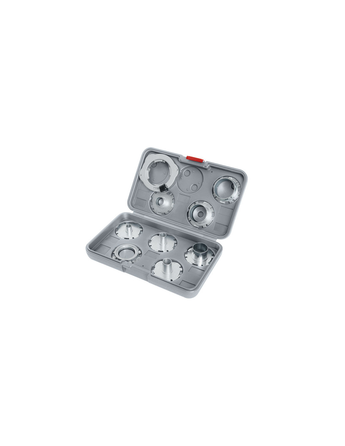 Natančni vodilni rezkarji - Komplet vodil za šablone PRO ponuja najbolj priljubljene vodila za šablone, vključno z velikimi in majhnimi rezkarji za rogljičenje in polmerom, ki so zasnovana za zanesljivo in natančno delovanje. Komplet je nameščen v močni škatli, ki vam pomaga, da so vodila za šablone varna in dobro organizirana. Šablone lahko kliknete na hitro zamenljivo osnovno ploščo rezkalnika Bosch. Če pa morate uporabiti vodilo za šablono z navoji, lahko uporabite adapter za hitro zamenjavo, da ga enostavno namestite.